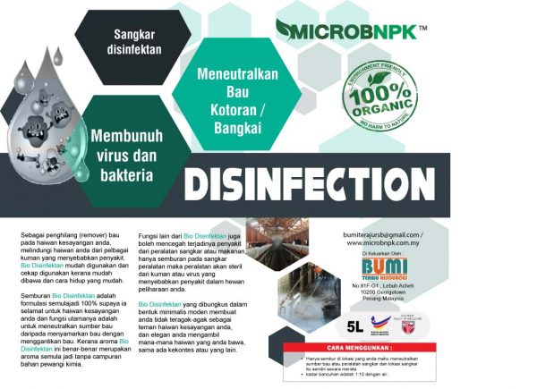 Sebagai penghilang (remover) bau pada haiwan kesayangan anda, melindungi haiwan anda dari pelbagai kuman yang menyebabkan penyakit. Bio Disinfektan mudah digunakan dan cekap digunakan kerana mudah dibawa dan cara hidup yang mudah.