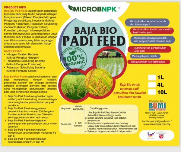 Baja Bio Padi Feed adalah agent penggalak tanaman padi yang terdiri daripada nitrogen fixing inoculant (Mikrob Pengikat Nitrogen), Phosphate solubilizing inoculants (Mikrob Pengurai Fosforous), Potassium solubilizing inoculants (Mikrob Pengurai Kalium). Formulasi gabungan ini menyediakan semua bio inoculants yang diperlukan untuk tanaman padi.